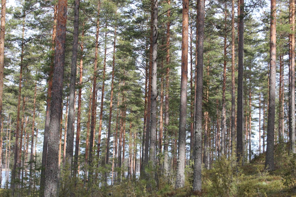 Kiertelen männikössä. Otan valokuvia. Painan mieleeni katajikot ja järven kimalluksen punertavien runkojen lomassa. Kerään kantarellit ja maistelen puolukat. Paksu sammal tuntuu hyvältä jalkojen alla. Kiipeän kalliolle ja silmäilen puustoa. Mahtavien mäntyjen rungot ovat paksun kaarnan peitossa.