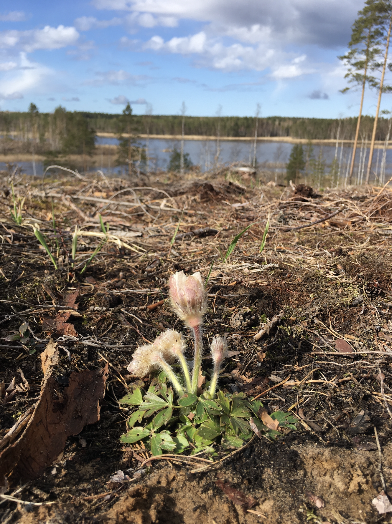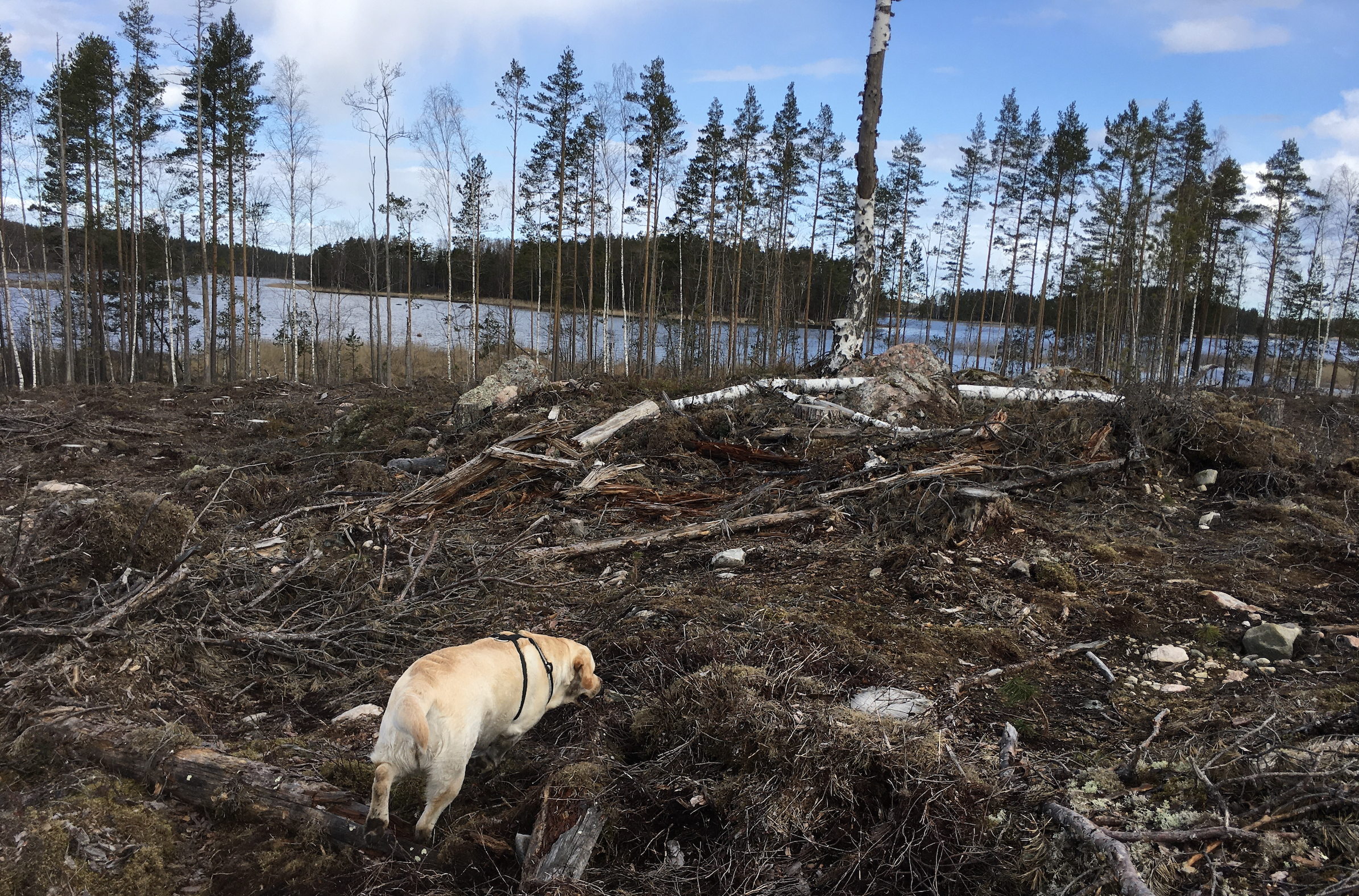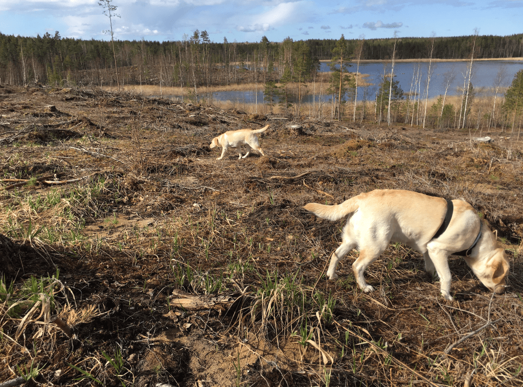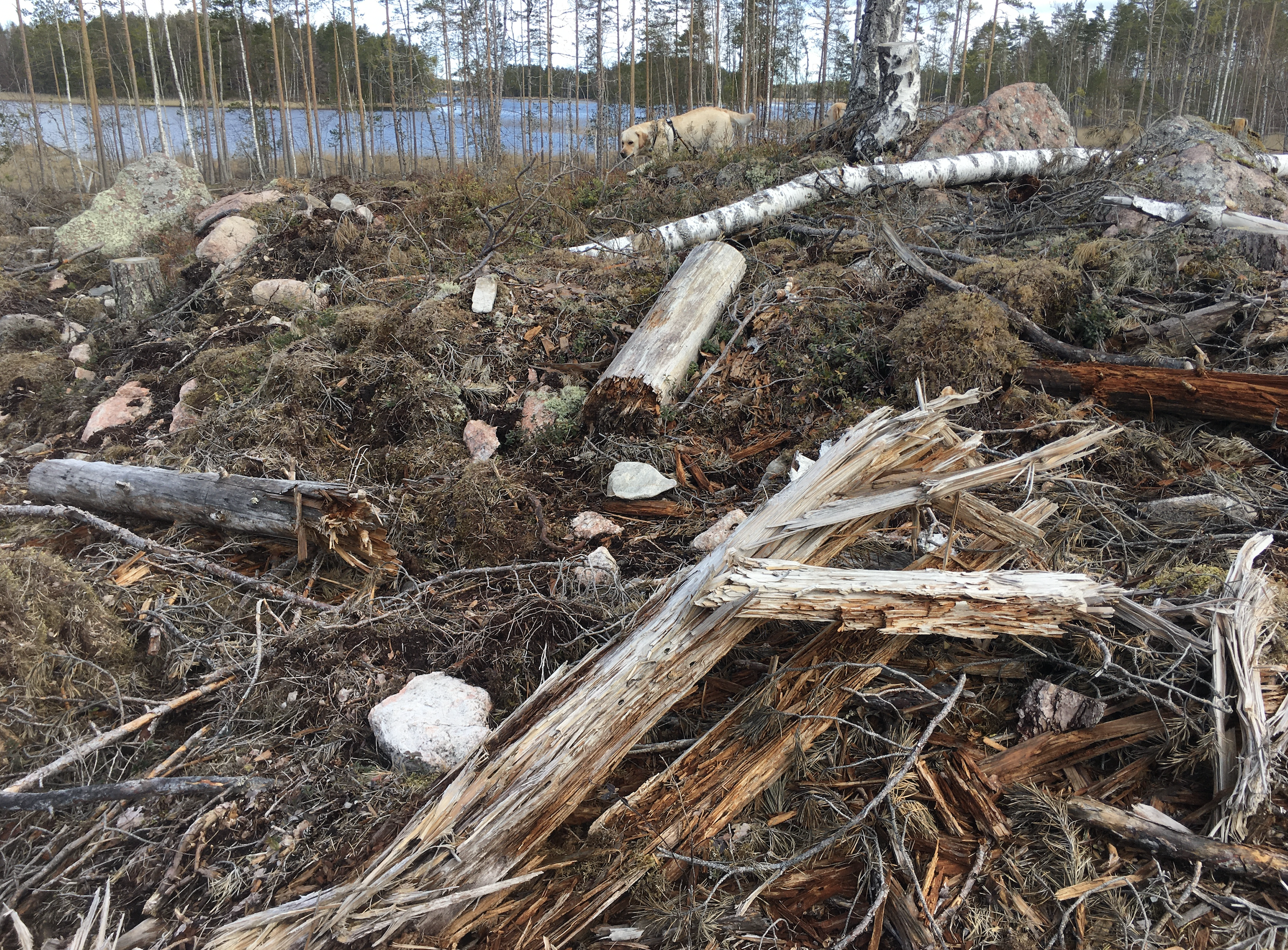 Kesä on kuiva ja helteinen. Katselen istutettujen taimien ruskeita neulasia. Todennäköisesti osa niistä selviää. Rankat sateet valuttavat suojatonta hiekkaa ja ohutta kuivaa humuskerrosta kohti järveä. Tuulenpuuskat kaatavat kymmeniä uusia runkoja hakkuualueen reunamilta.