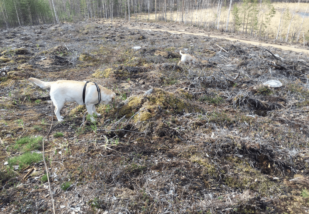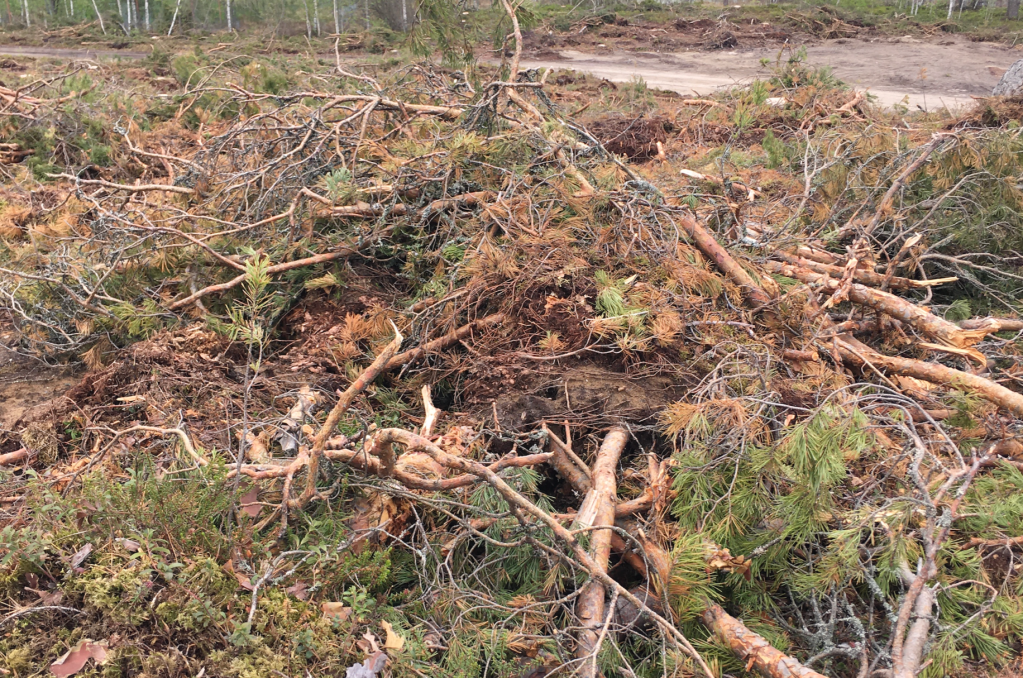 Tältä näyttää metsän päätehakkuu. Paksut rungot lojuivat sikin sokin. Valtavat mäntyjen latvaoksat törröttävät kasoista. Työkoneiden renkaat ja telat ovat repineet maan rikki.